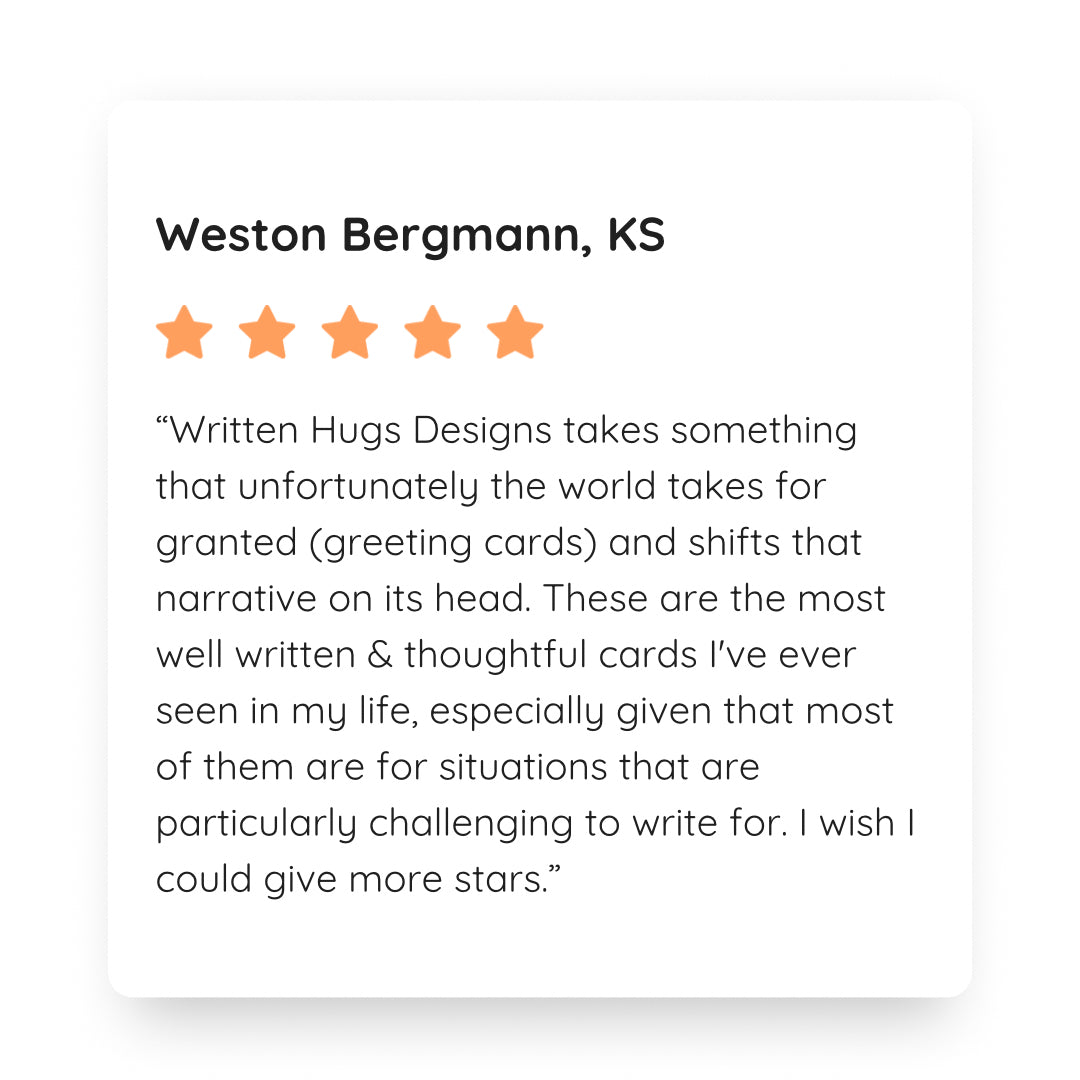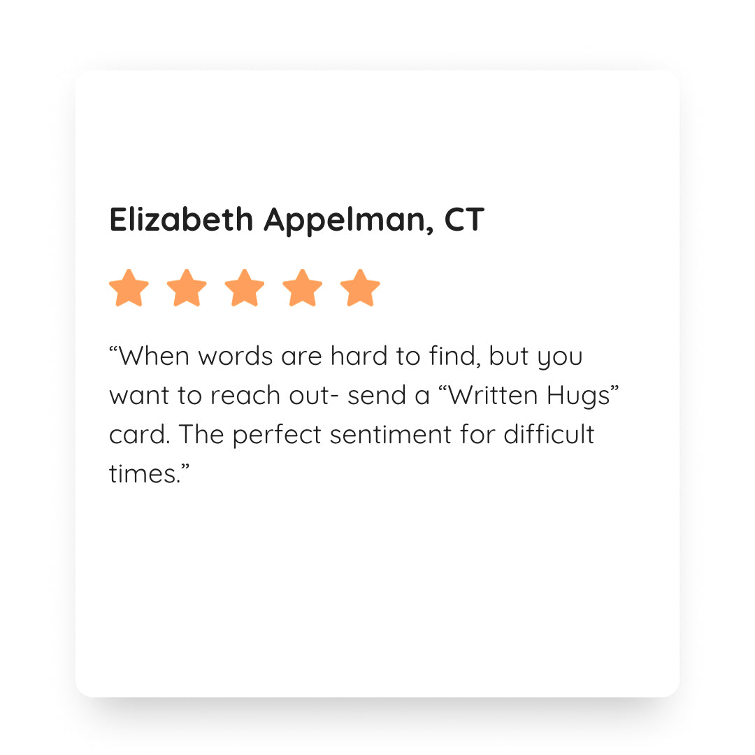 For each Written Hugs card you send, I donate another to someone facing grief, illness, foster care, and more—multiplying the kindness you already started. Here’s How