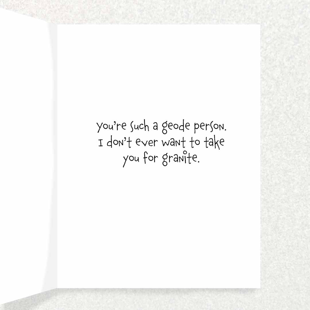 The cover has a rocker rock smiling with a geode Mohawk with the words “You Rock!”. Inside inscription says, “You are such a geode person. I don’t ever want to take you for granite.”